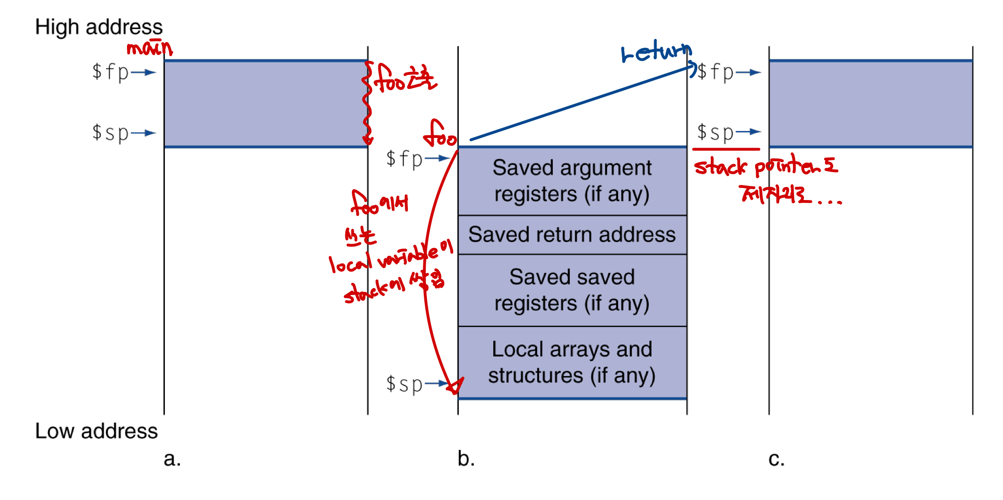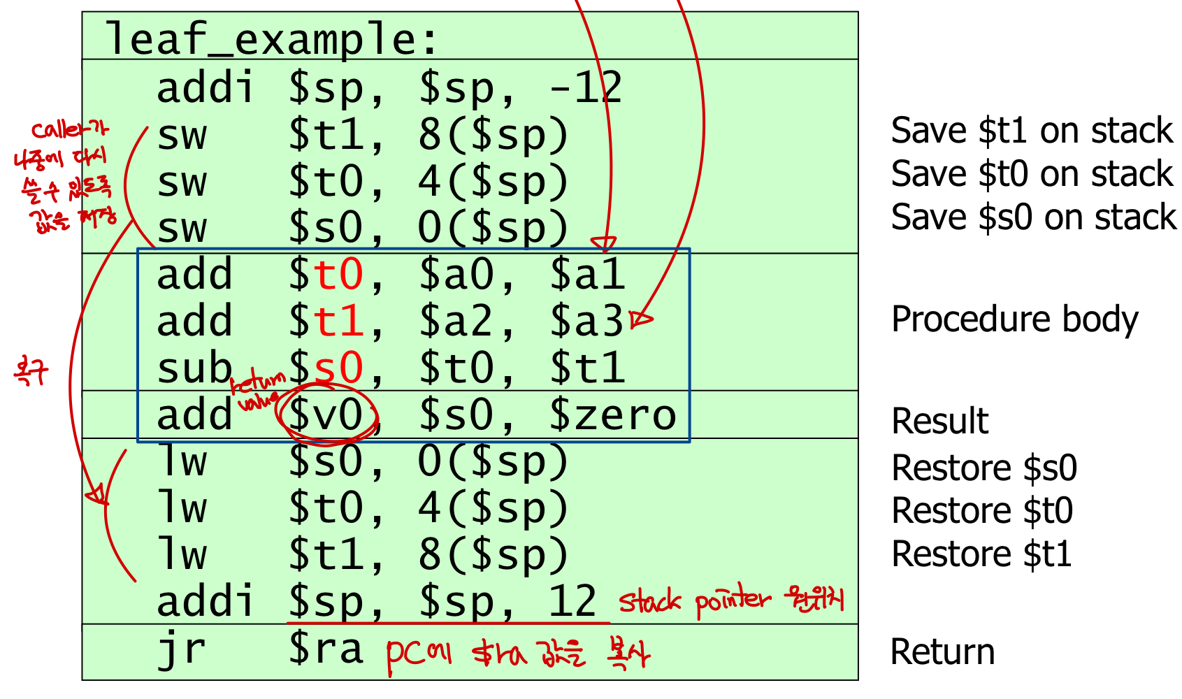 - $sp는 스택의 top을 가리키고 있고, $fp는 이번 프로시저에 할당되기 직전 가리키고 있던 stack pointer를 가리키고 있다.
