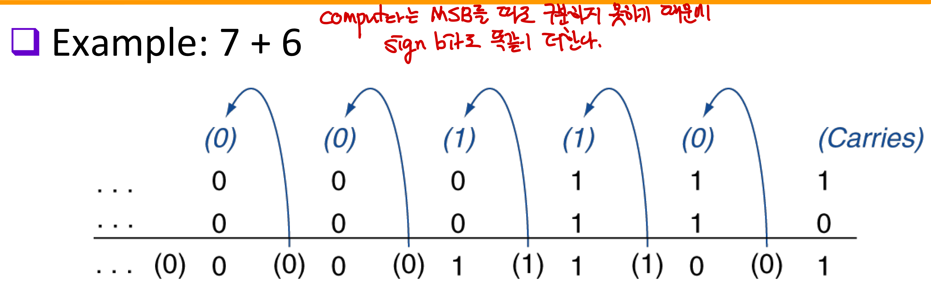 - 양 + 양의 덧셈에서 Overflow가 일어날 수 있다. (MSB가 1로 carry되면서 음수화 발생)