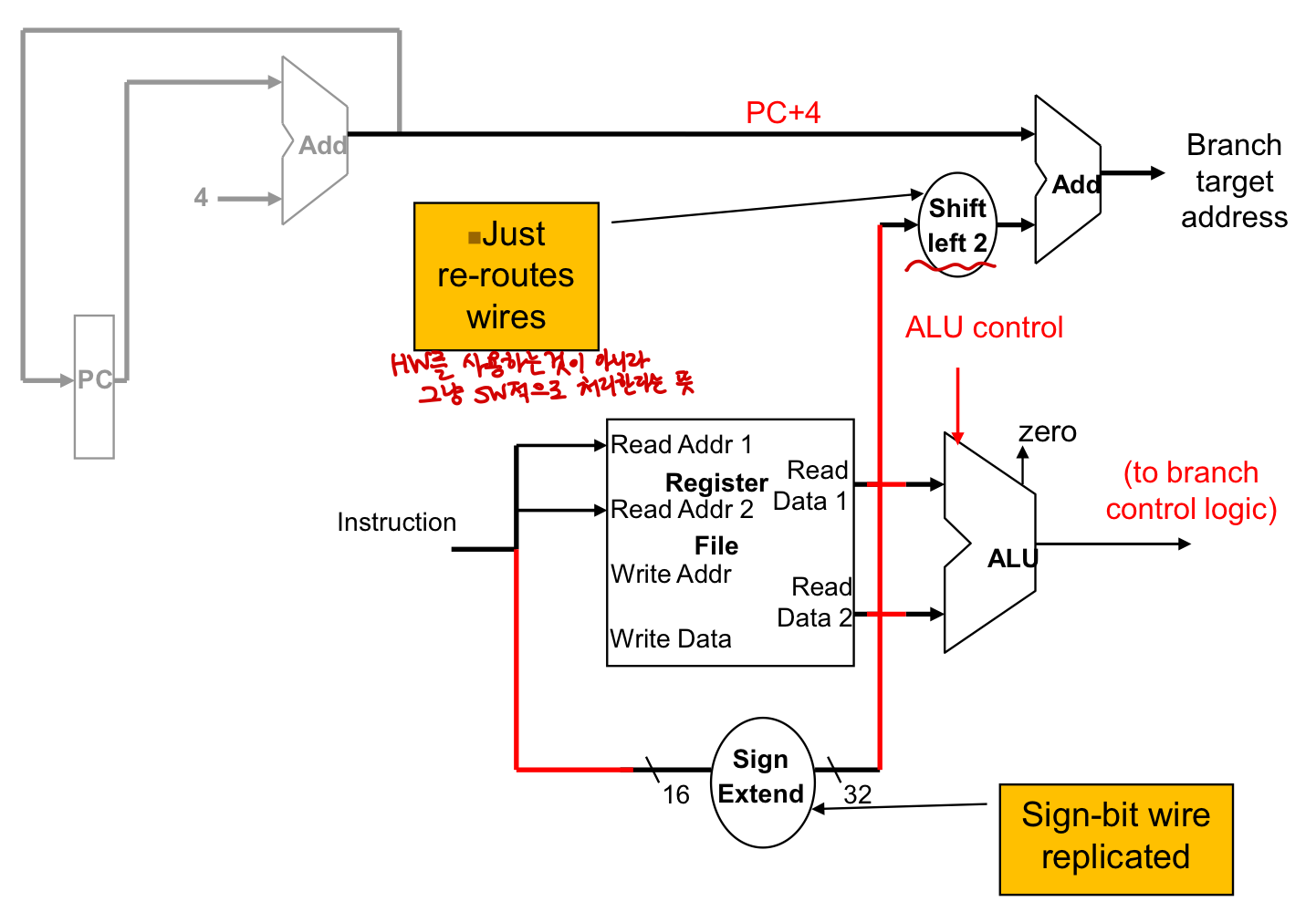 - lw/sw와 마찬가지로 offset은 Sign Extend하여 32bits로 만들어주는데, branch에서는 추가적으로 2번 shift left 한다. (offset*4를 위해 -> 4byte 단위이기 때문에 하위 2bits이 00이기 때문)